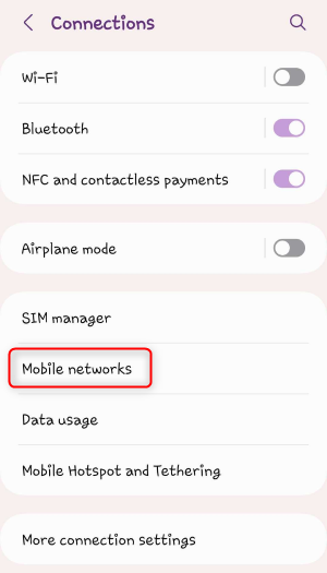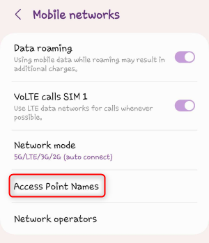 1. Select Mobile Networks, then tap Access Point Names (APNs).2. Choose your active APN from the list.