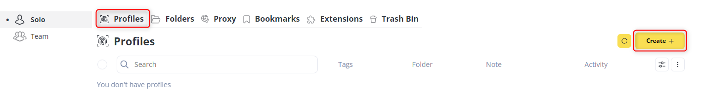 1. From the Antik dashboard, navigate to the Profiles tab.2. Click Create to start configuring a new browser profile.