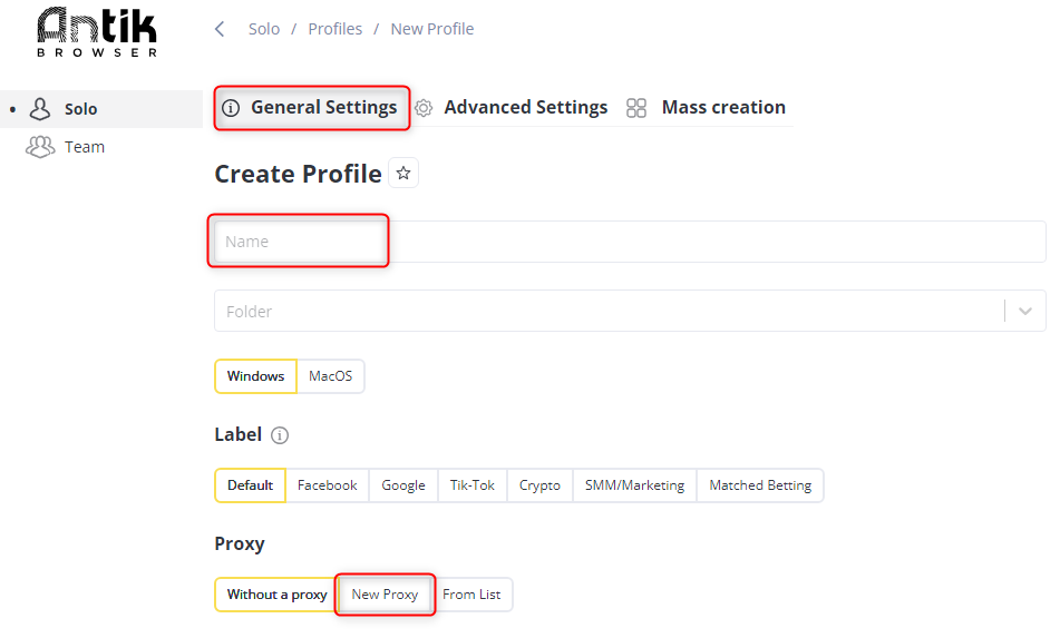 1. Under the General Settings tab, locate the Name field and enter a recognizable name for your profile.2. Navigate to the New Proxy tab.