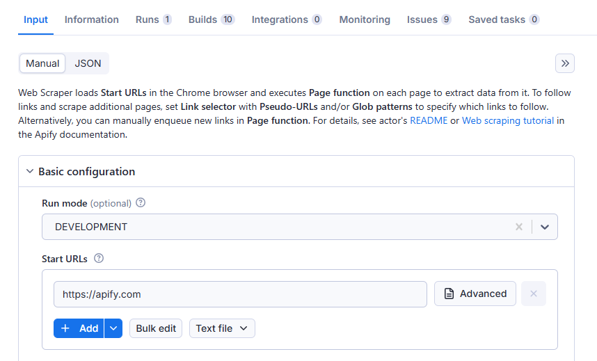 1. In the Input tab, find the Basic Configuration section.2. Enter the target URLs of the web pages you want to scrape.3. Add one or multiple URLs depending on your scraping requirements.