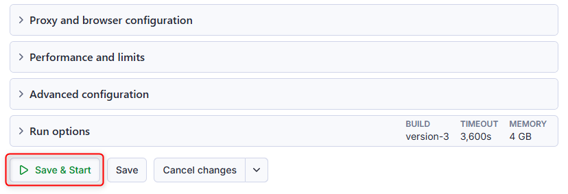 1. Once the proxy configuration is complete, click Save & Start to launch the actor.2. Check the logs to ensure the task runs smoothly and that the Toolip proxy is active.