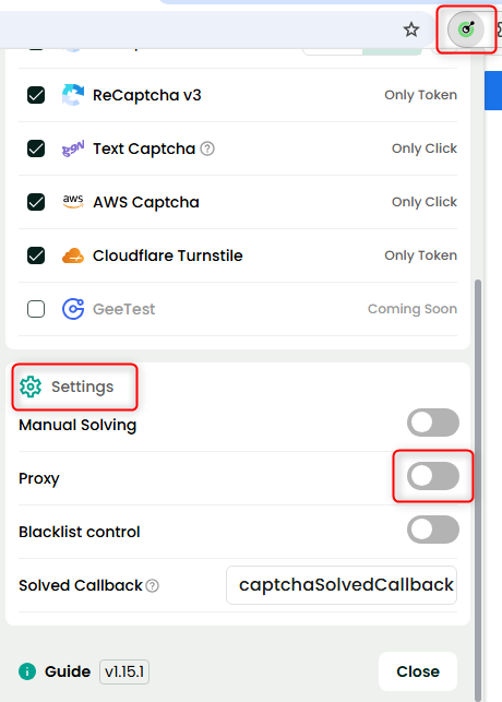 1. Open the Capsolver Extension.2. Navigate to the Settings section.3. Locate the Proxy option and toggle it On to enable proxy settings.