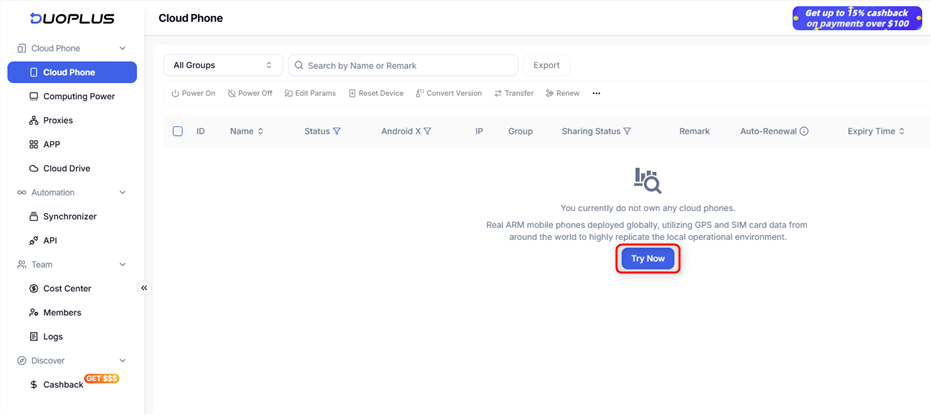Go to your DuoPlus dashboard and click Try Now to create a new Cloud Phone if you don’t have one.