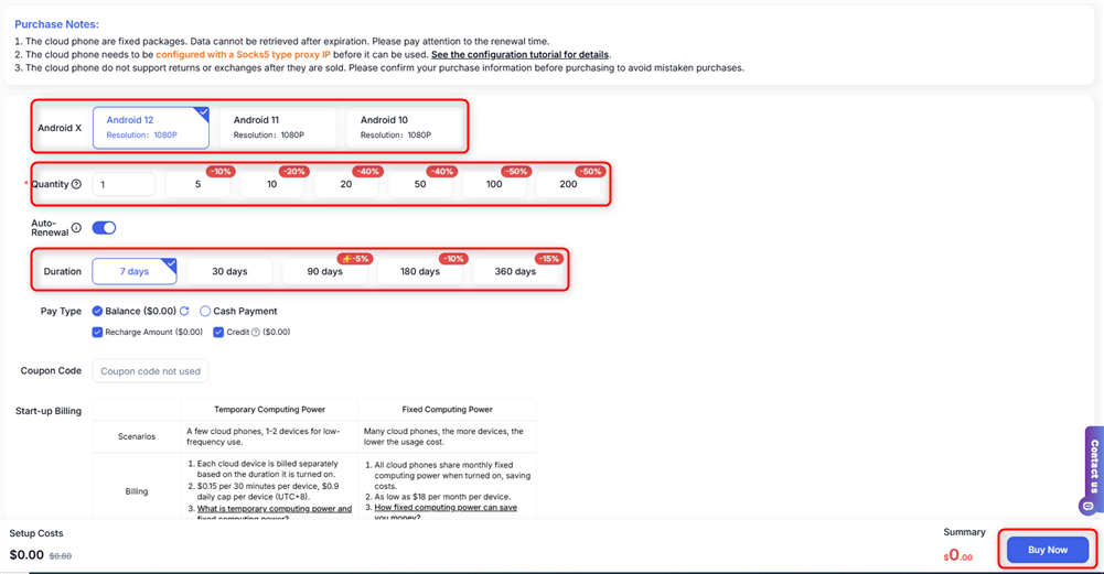 In the Cloud Phone dashboard, choose your preferred Android version, Quantity, and Duration, then click Buy Now.