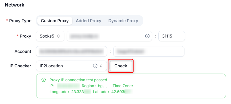 Click the Check button to verify the proxy. If it’s working, a green tab will appear displaying the proxy details.