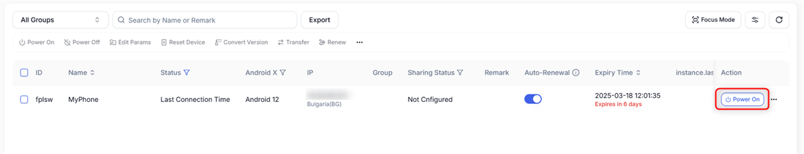 Complete the configuration, return to the main dashboard, and click Power On to start your Cloud Phone.