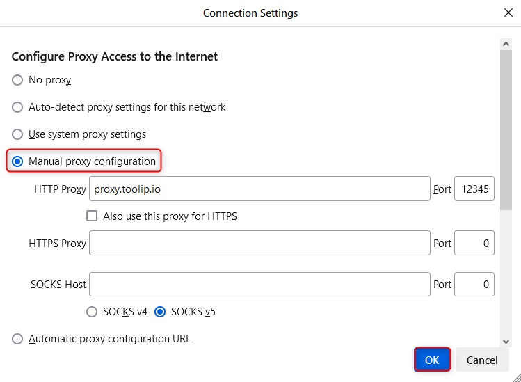 1. In the Network Settings window, select Manual proxy configuration.2. Enter your Toolip proxy details: