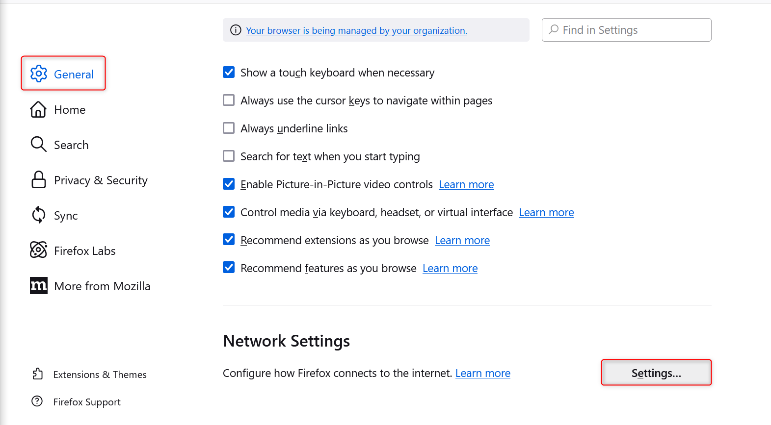 1. Scroll down in the Settings menu.2. Locate the Network Settings section.3. Click Settings to open the proxy configuration panel.