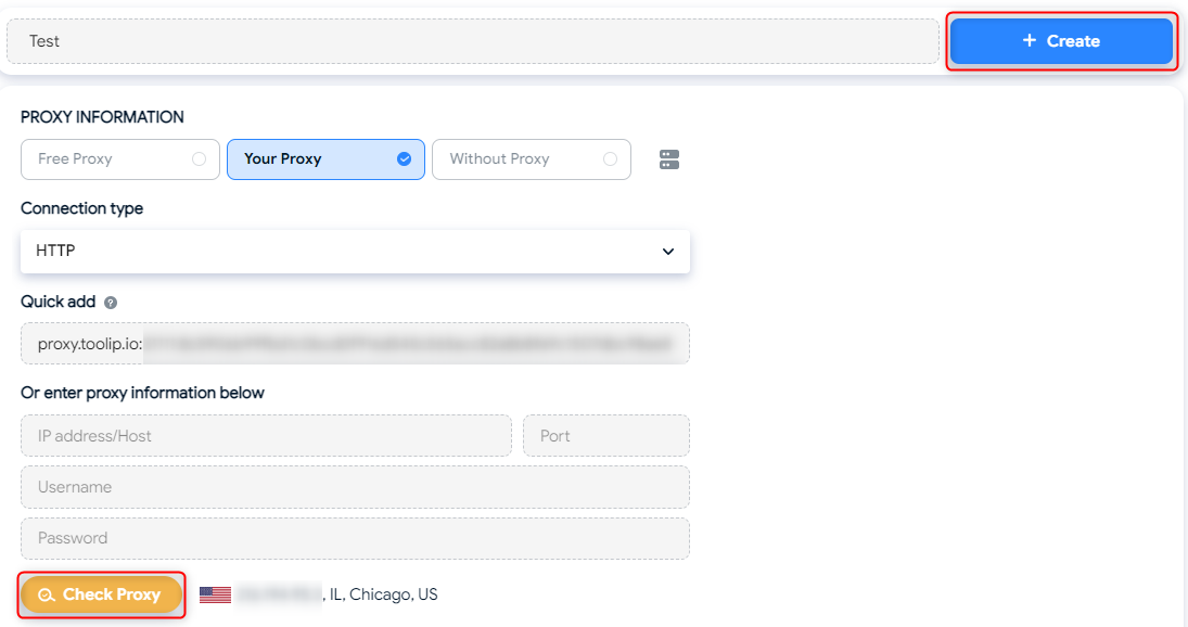 1. Go to your Toolip dashboard and click on the Show Configured List button.2. Under the Generic tab, copy the proxy code provided.3. Paste this code into the Quick add field in HideMyAcc.4. Click Check Proxy to verify the connection.5. Once the proxy configuration is verified, click Create to save your proxy settings.