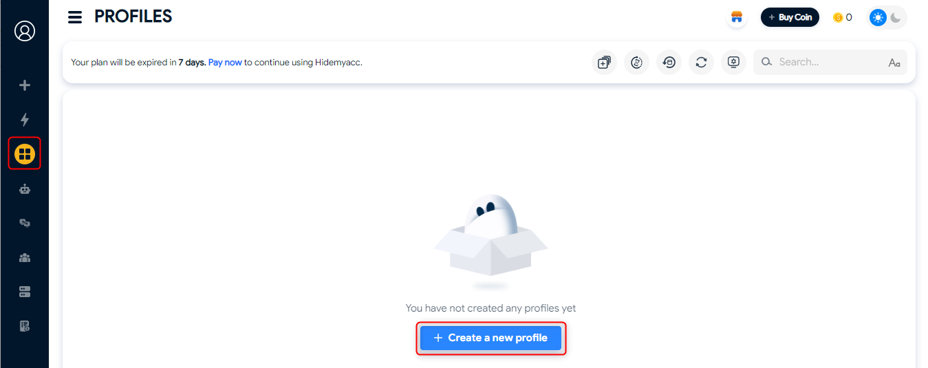 1. Open HideMyAcc and navigate to the Profiles tab.2. Click +Create a new profile to set up a new browsing instance.