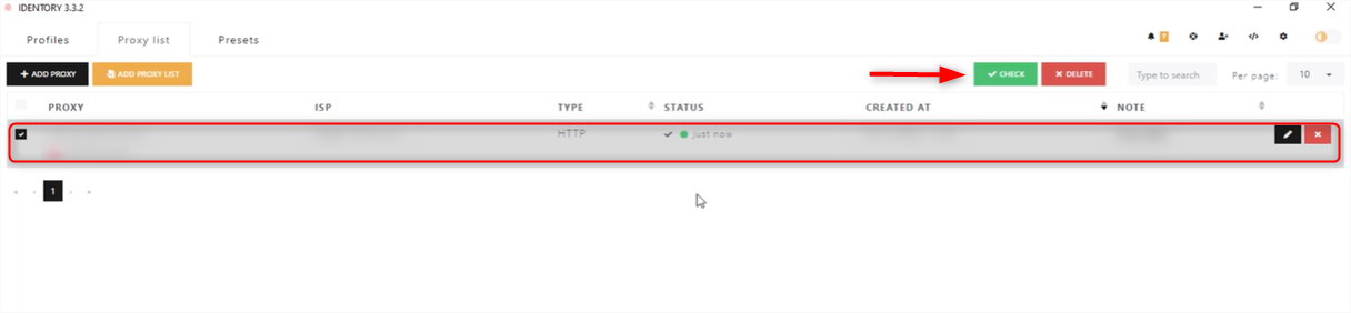 The newly added proxy will appear in the list. To test its functionality, click the green CHECK button.