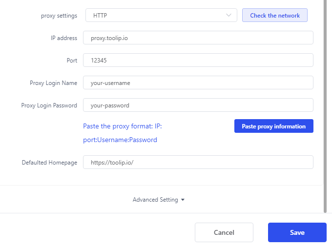 2. Enter your Toolip proxy details: