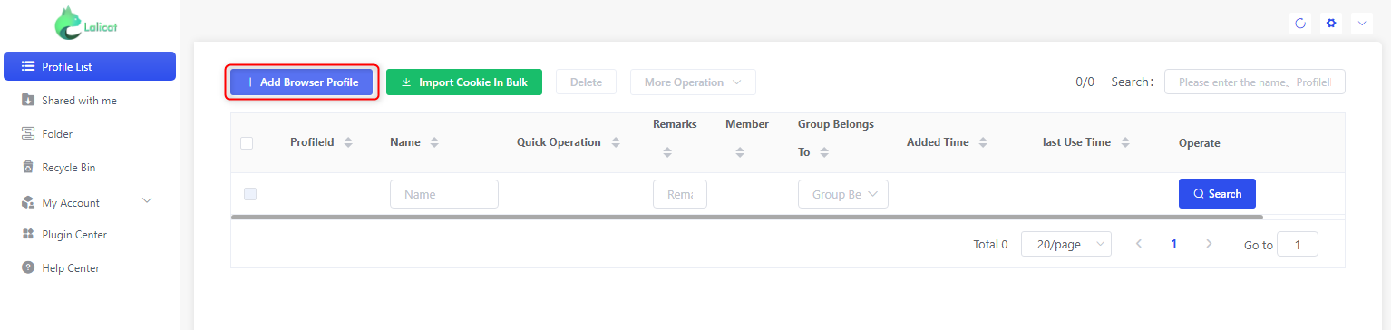 1. On the Lalicat home screen, click +Add Browser to create a new profile.