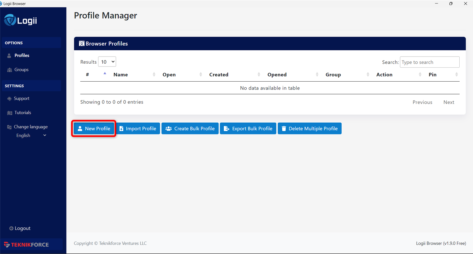 Click New Profile to create a new browsing profile.