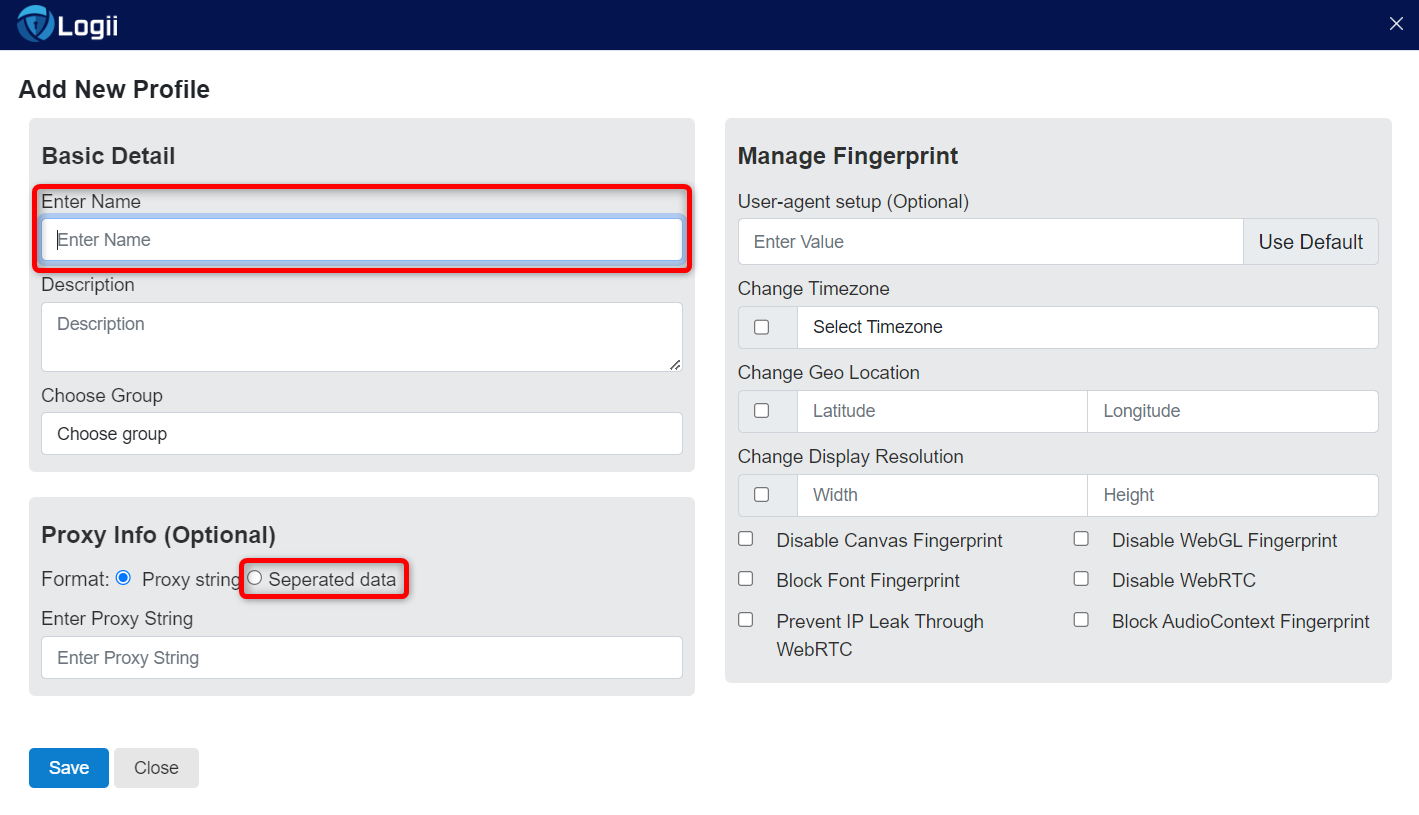 Assign a Name to the profile and, under the Proxy Info tab, select Separated data.