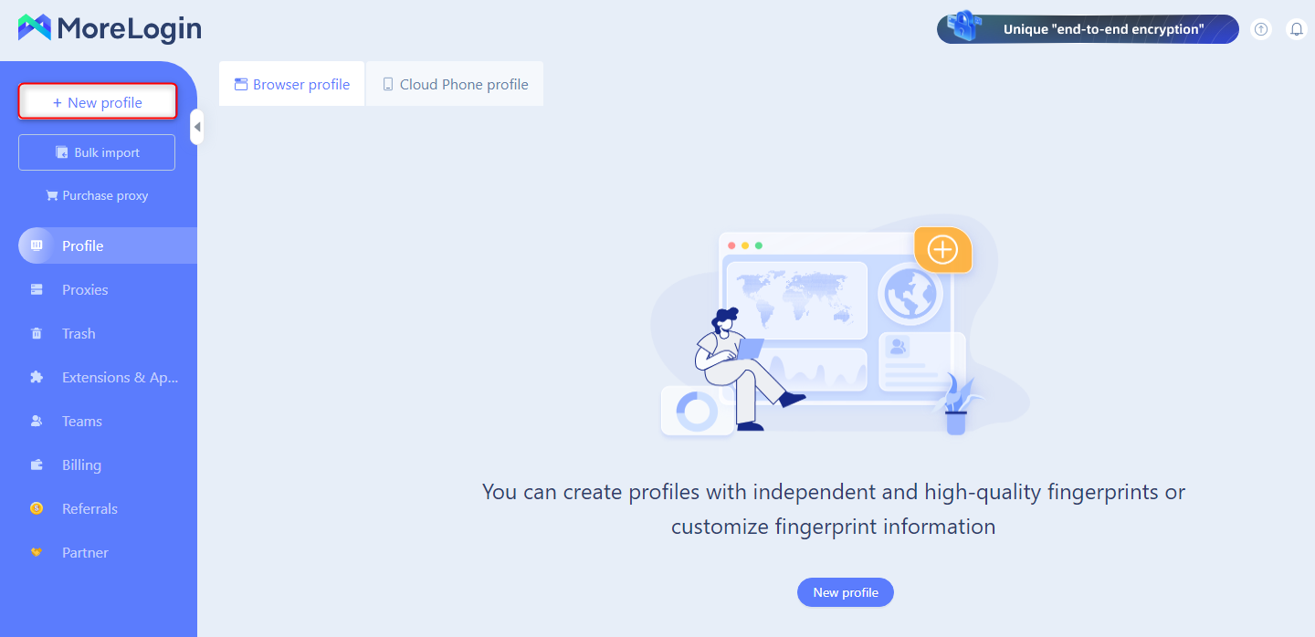 1. On the main dashboard, click +New profile to start setting up a new browser profile.