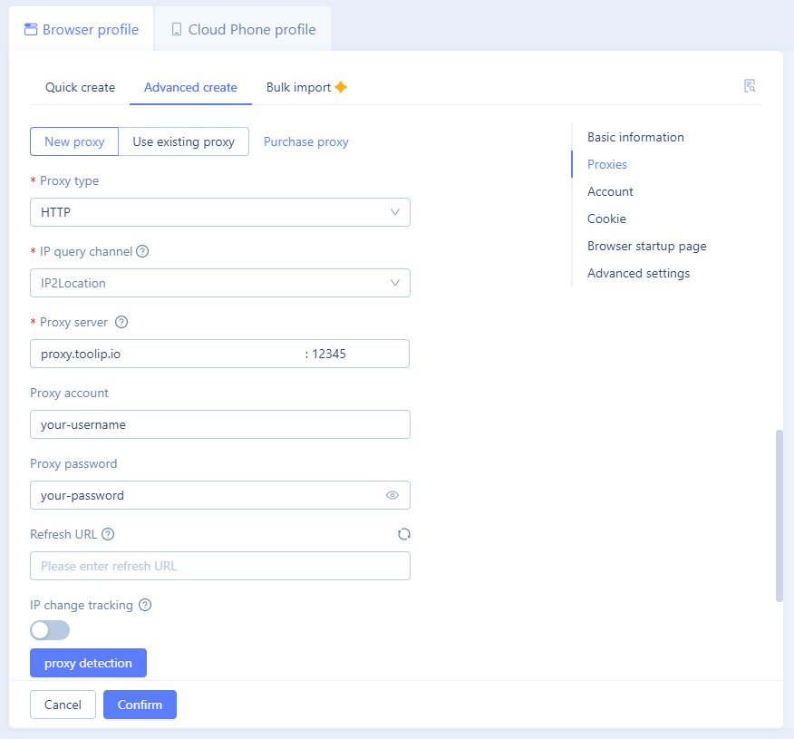proxy.toolip.io. - Proxy Port: Use the port number from your Toolip dashboard.