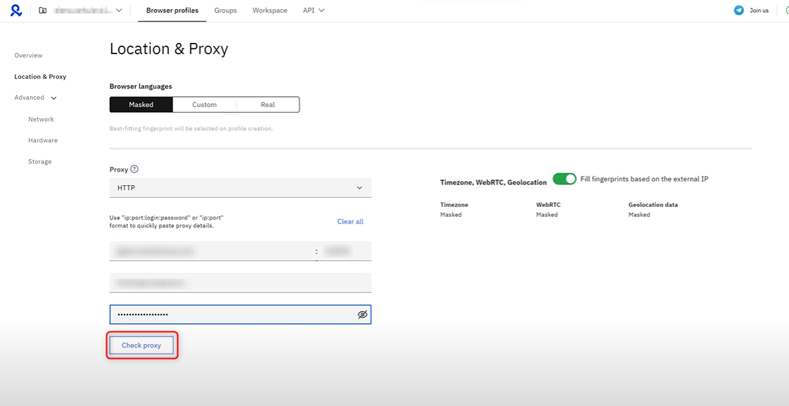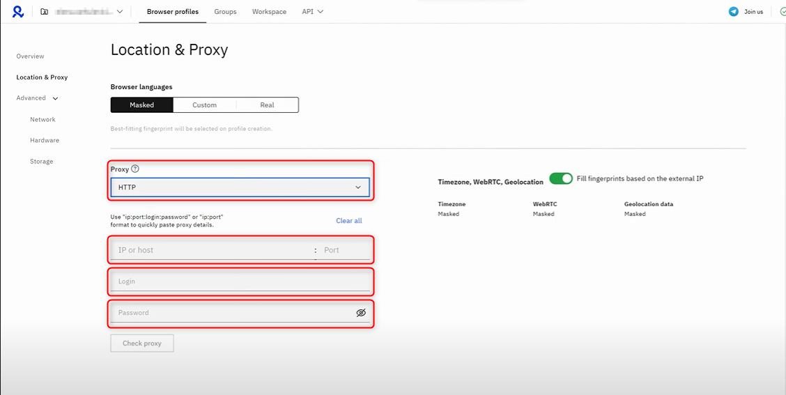 1. Navigate to the Proxy section in the profile settings.2. Select Custom as your proxy type and enter the following details: