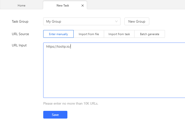 1. In the URL Input field, paste the website link you want to scrape.2. Click Save to load the webpage inside Octoparse.