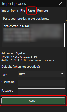 3. Switch to the Paste tab.4. Log in to your Toolip dashboard and click Show Configured List.5. Under the Generic tab, copy the provided proxy code.6. Return to OpenBullet and paste the proxy details into the proxies field.7. Click Accept to save your proxy settings.