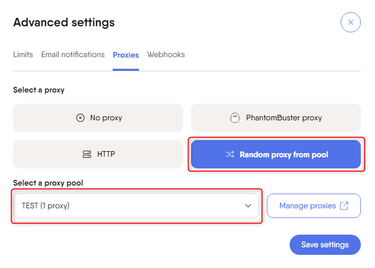1. When setting up a Phantom (automation task), go to the Advanced Settings.2. Select the proxy pool you created to apply it to your workflow.
