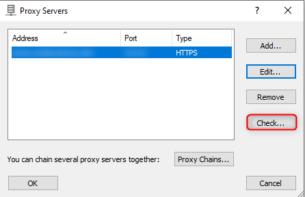 1. In the Proxy Servers section, select the proxy you added.2. Click Check and then Start Testing.