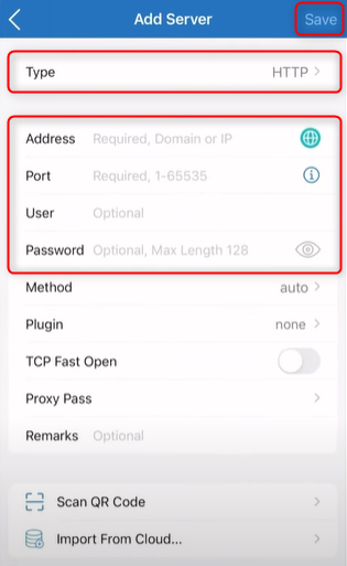 For iOS you can choose any Type of proxy protocol you desire, fill the credentials: