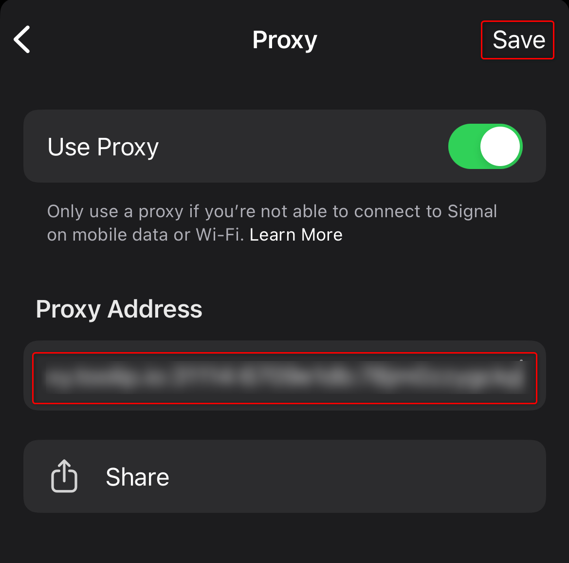Toggle on Use Proxy, enter your proxy credentials and tap Save to apply the configuration.