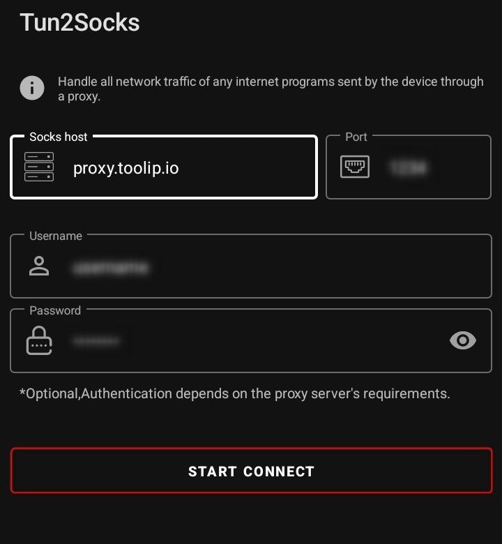 1. In the main Tun2Socks interface, input your Toolip proxy details: