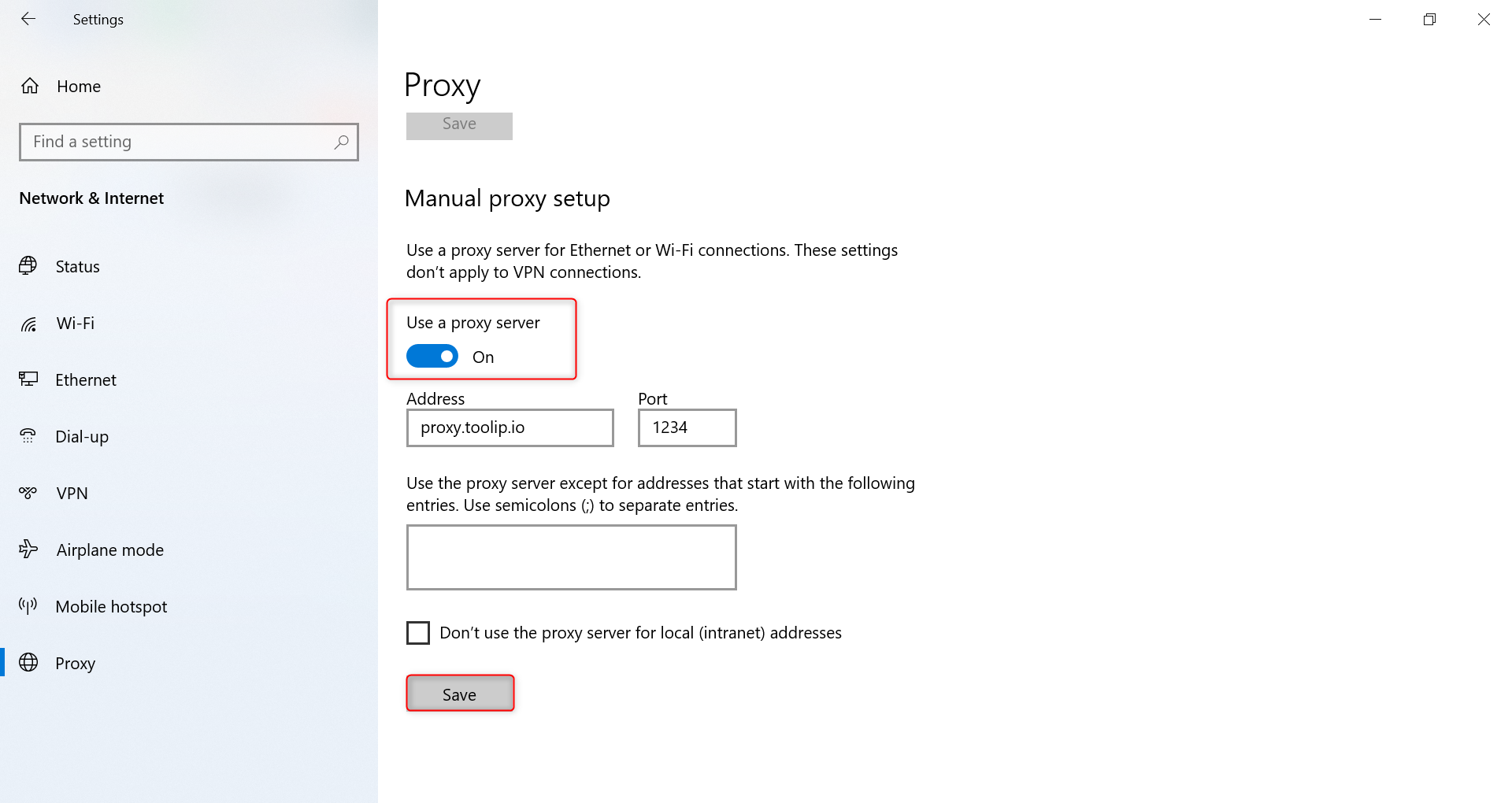 1. Scroll to Manual proxy setup and toggle Use a proxy server to On.2. Fill in the fields with your Toolip proxy details: