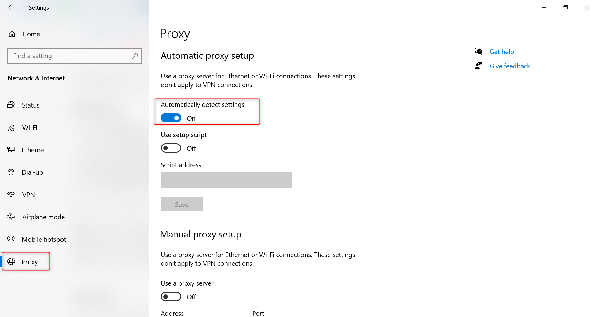 1. Click on Proxy in the sidebar menu.2. Under Automatic proxy setup, toggle Automatically detect settings to On.