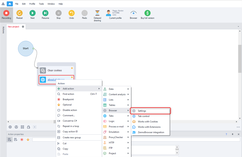 1. Right-click within the workflow area.2. Select Add Action, then navigate to Browser > Settings.
