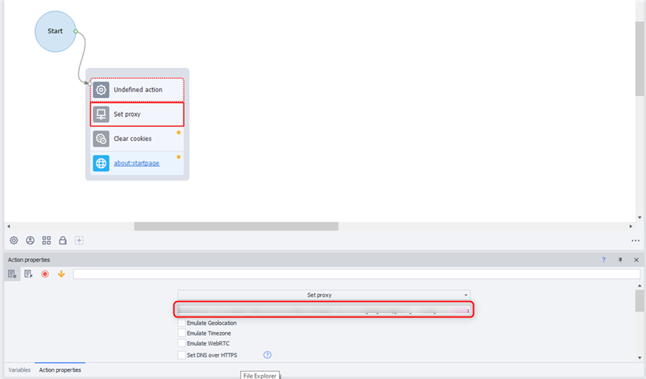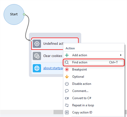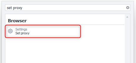 1. Right-click inside the workflow and select Find Action.2. In the search bar, type Set Proxy and select it.