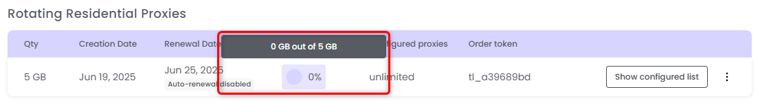 Hover over the pie chart under Bandwidth (GB) to view the remaining bandwidth for that specific proxy.
