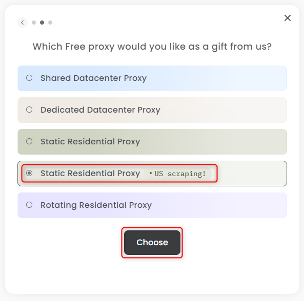 Choose Static Residential Proxy - US scraping from the list, then click Choose